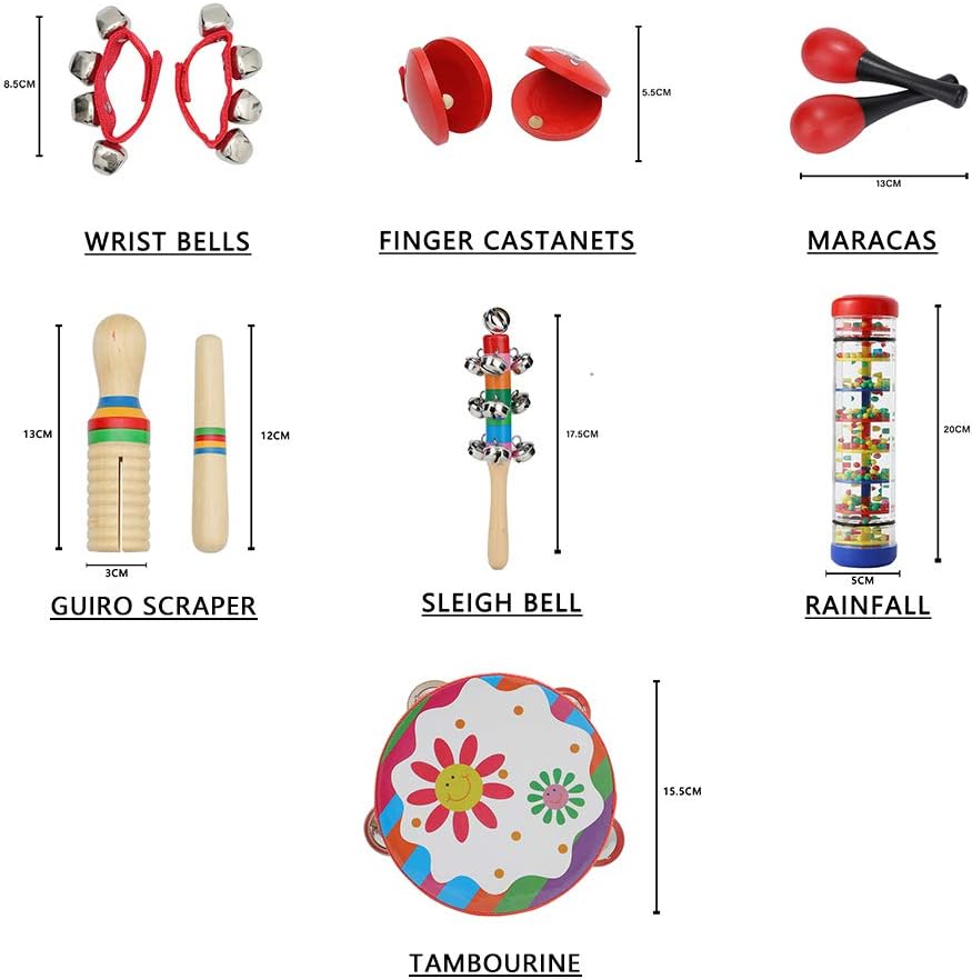 - Musical Instruments Toys Set: Percussion instruments set comes with 8 types 12 pcs colorful instruments: Wrist Bells, Finger Castanets, Maracas, Rainmaker, Tambourine, Guiro Scraper, Sleigh Bell and Storage bag