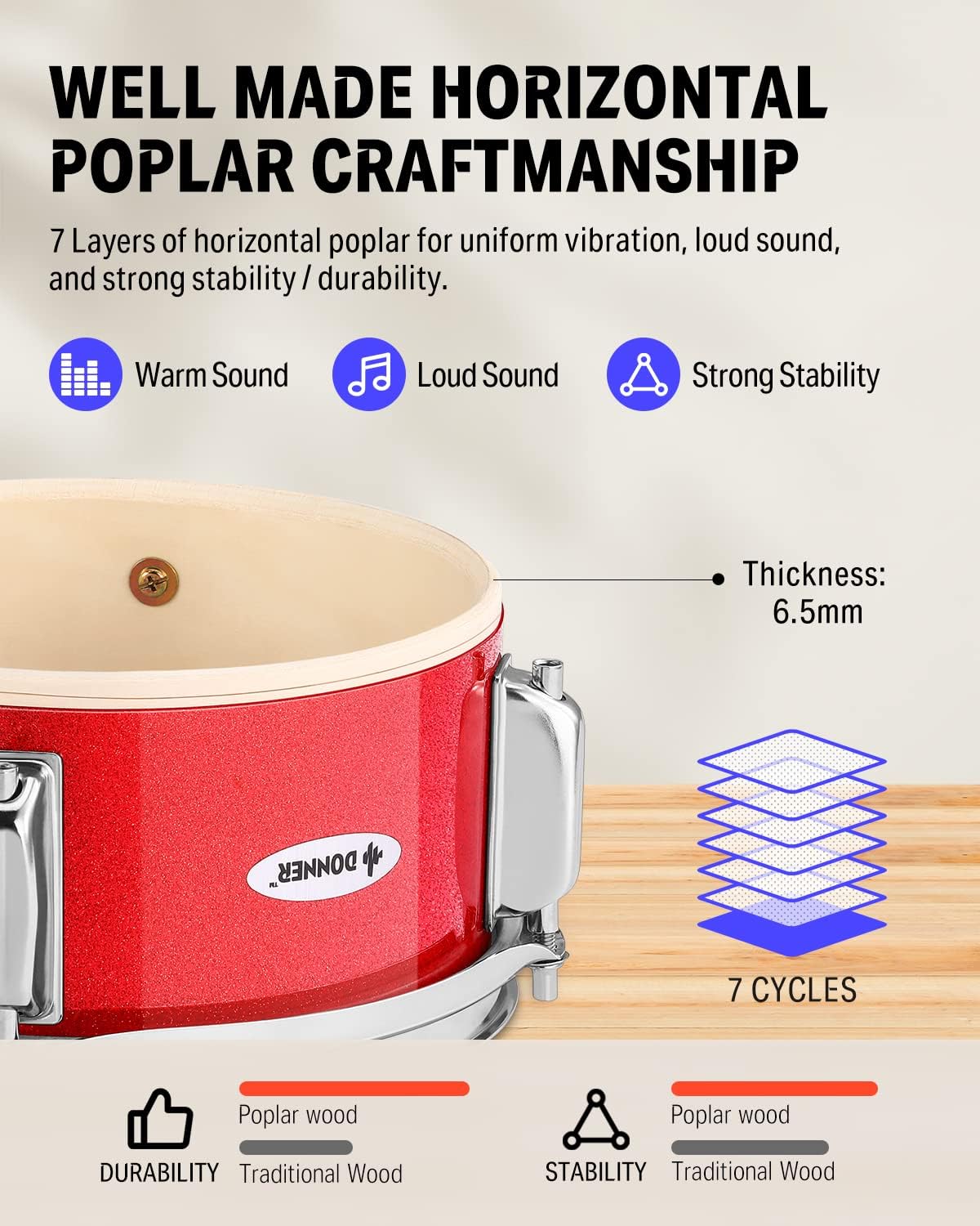 - [High Quality] The drum shell is made of horizontal-grained poplar wood, with high strength, uniform vibration and loud sound. It adopts a 6-ear structure, which has greater skin tension and better skin vibration than similar products. The bass drum is made of high-quality silver rims with coated brackets