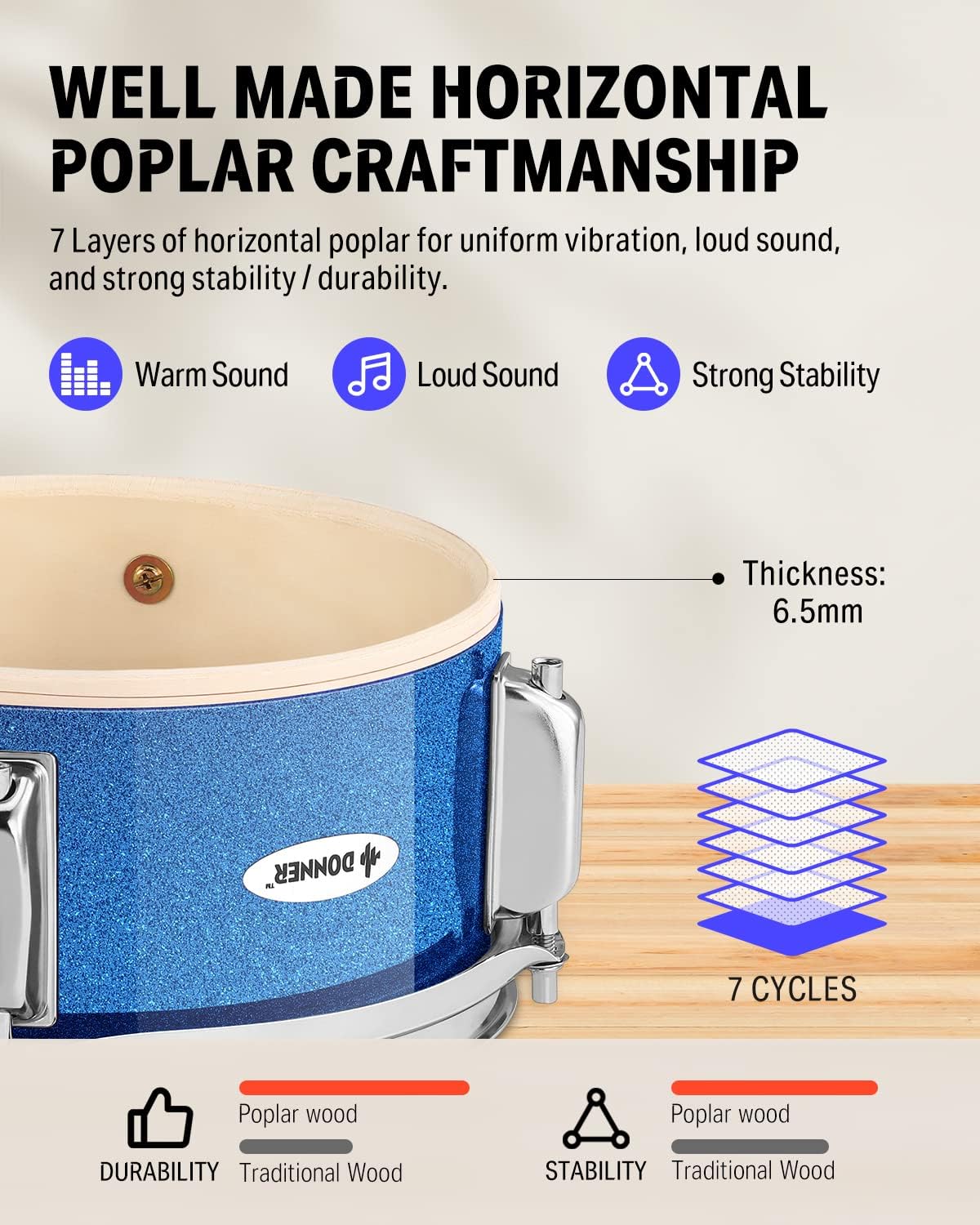 - [HIGH QUALITY] The drum shell is made of horizontal-grained poplar wood. with high strength, uniform vibration and loud sound. It adopts a 6-ear structure, which has greater skin tension and better skin vibration than similar products. The bass drum is made of high-quality silver rims with coated brackets