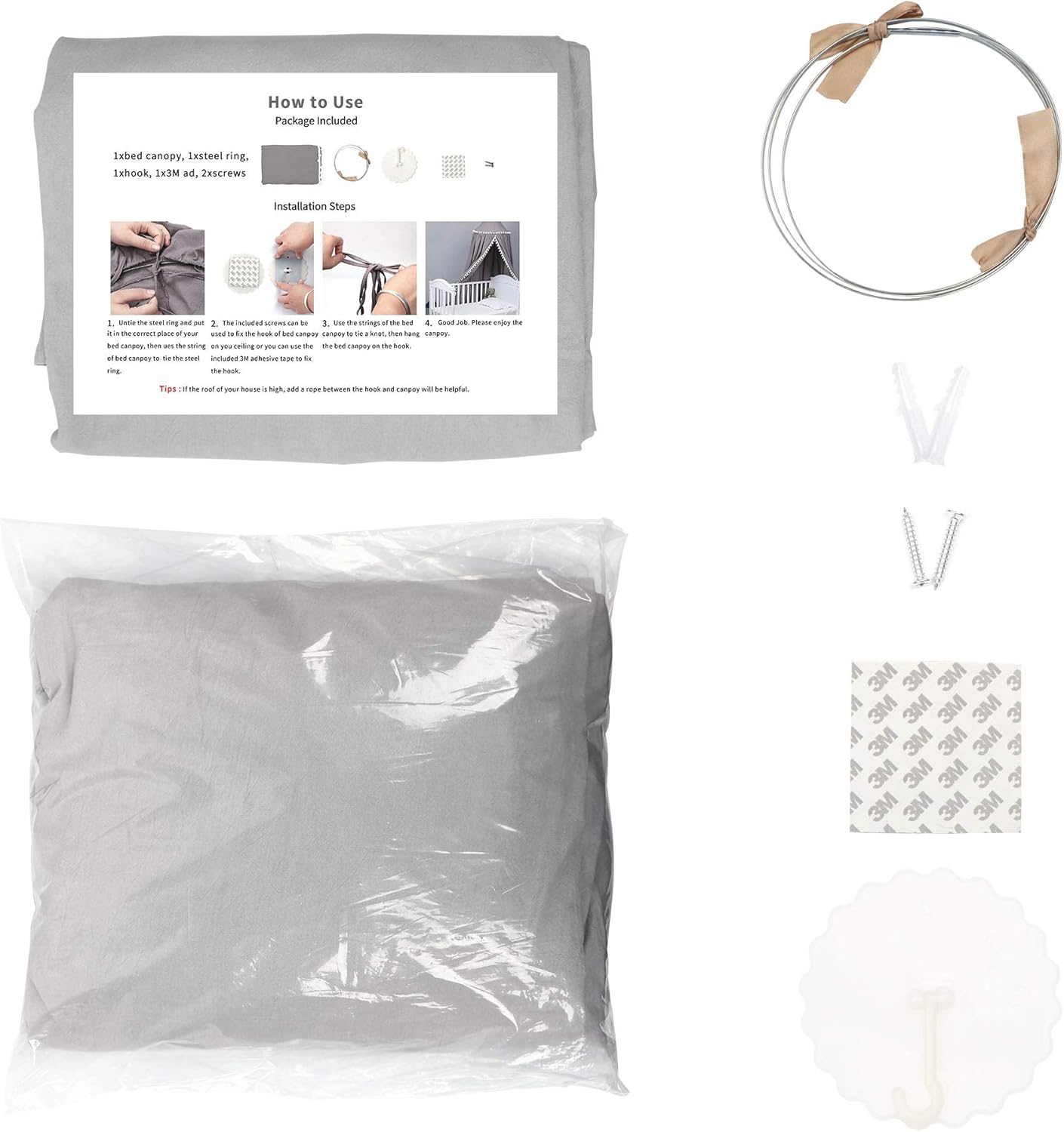 - BIGGER SIZE & EASY TO ASSEMBLE - Kids canopy total height 95”; upper part length 20”, dome diameter 20”. Suitable for crib/cradle/bassinet/cot, toddler bed, play area mat/rug. Features an opening for easy entrance and cutest frills decoration! Package Included: 1 x bed canopy, 1 x steel wire, 1 x double-adhesive tape & hook panel, 2 x self-tapping screws, 1 x user manual