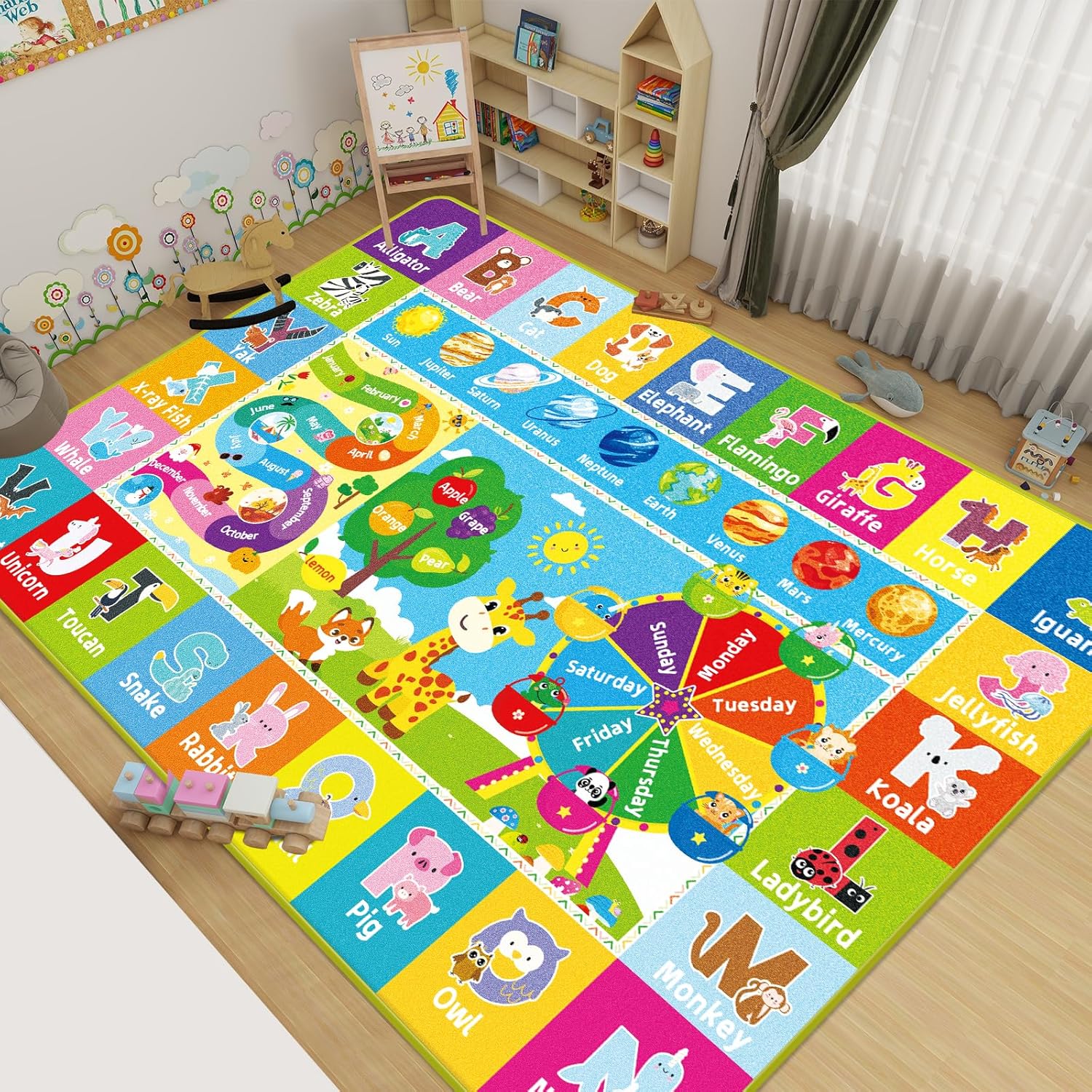 - Fun & Educational Design: Designed to engage and educate, this playroom rug introduces children to a variety of topics including animals, colors, shapes, numbers, seasons, and more. Its vibrant, eye-catching illustrations stimulate your childโs cognitive development and foster early learning through play, making it an enjoyable experience for both fun and education.