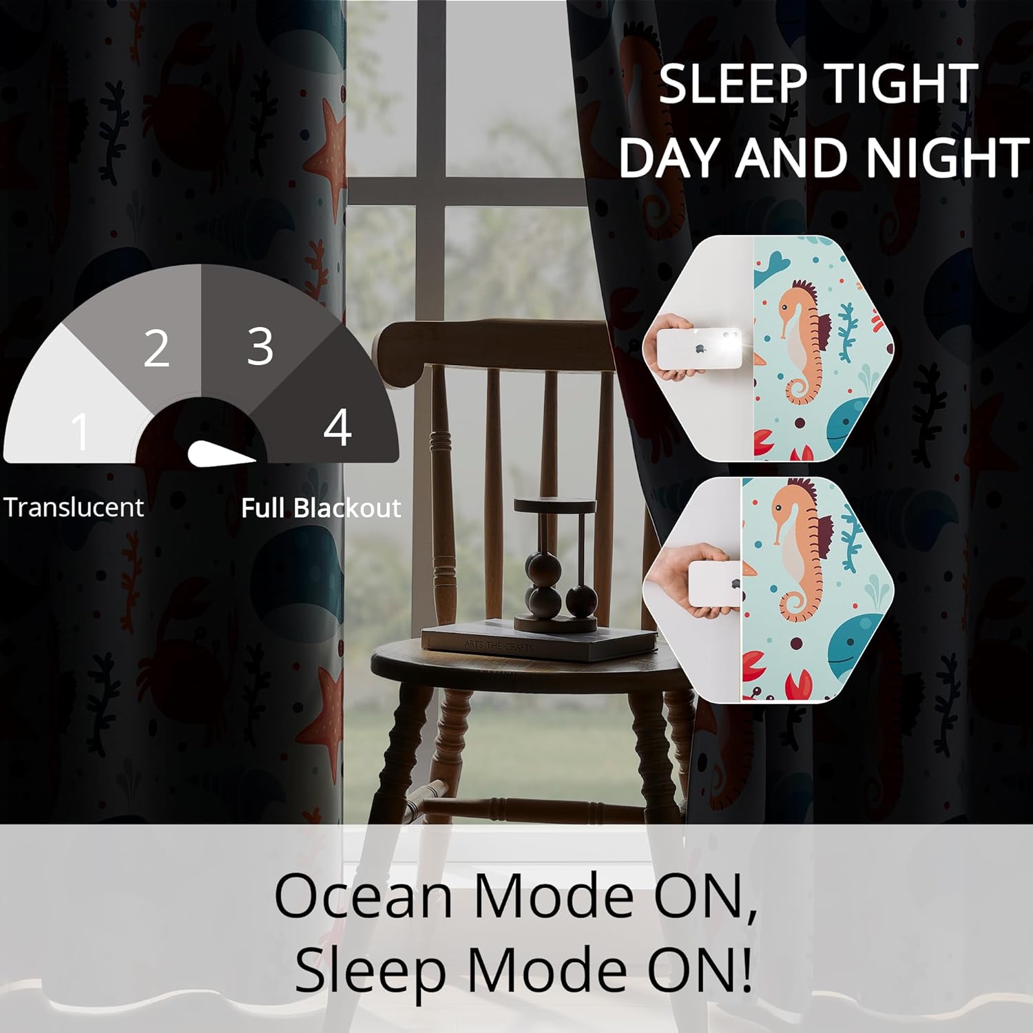 Kids Blackout Curtains - Ocean Whale Design, 100% Blackout, 2 Panels, Each W52×L84, Thermal Insulated for Bedroom, Noise Reducing, Excellent Colorfastness, Dive into an Underwater Adventure