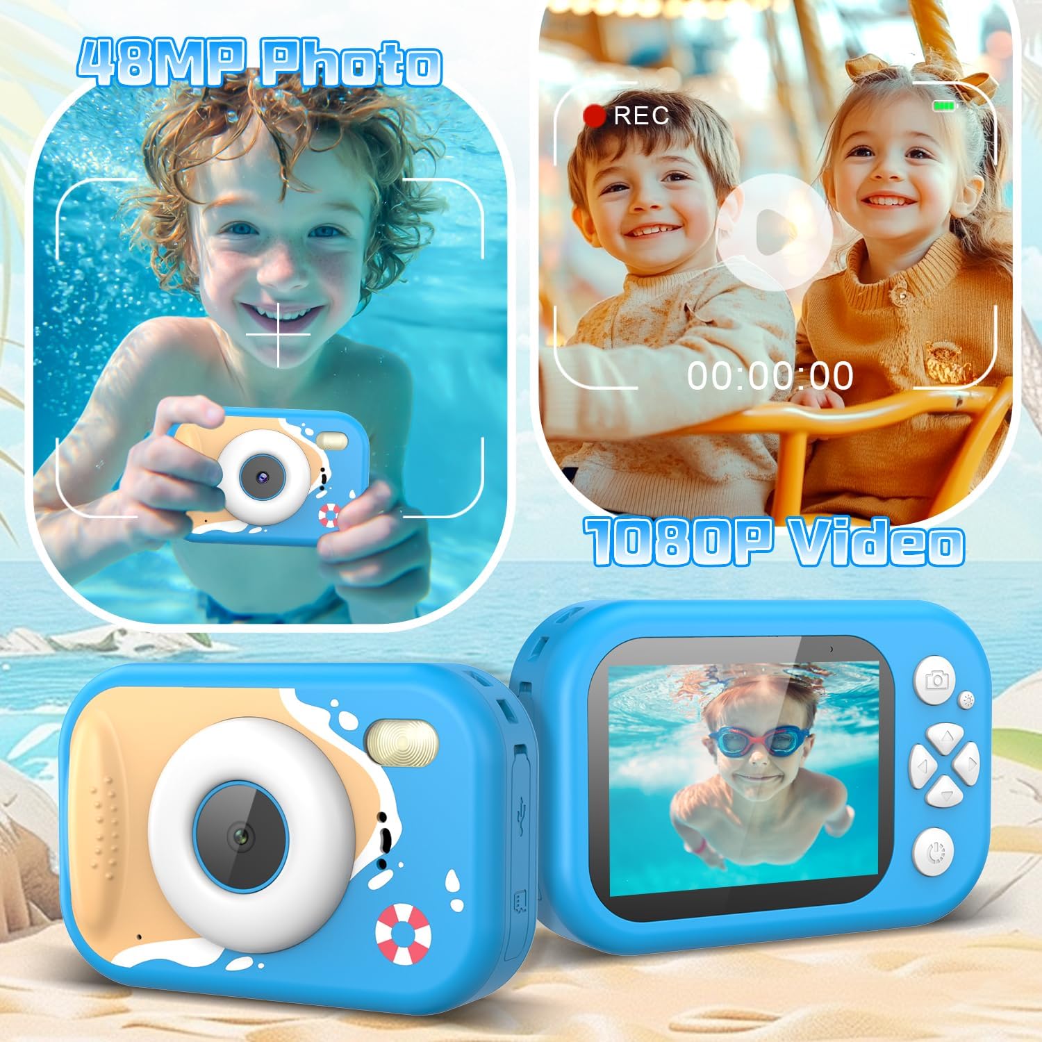 Kids Camera Waterproof, IP68 Underwater Camera for Kids Aged 3-12, HD Kids Digital Camera with 1080P Video Recording, Durable ABS Material, Pool Toys for Boys Girls with 32GB Card(Blue)
