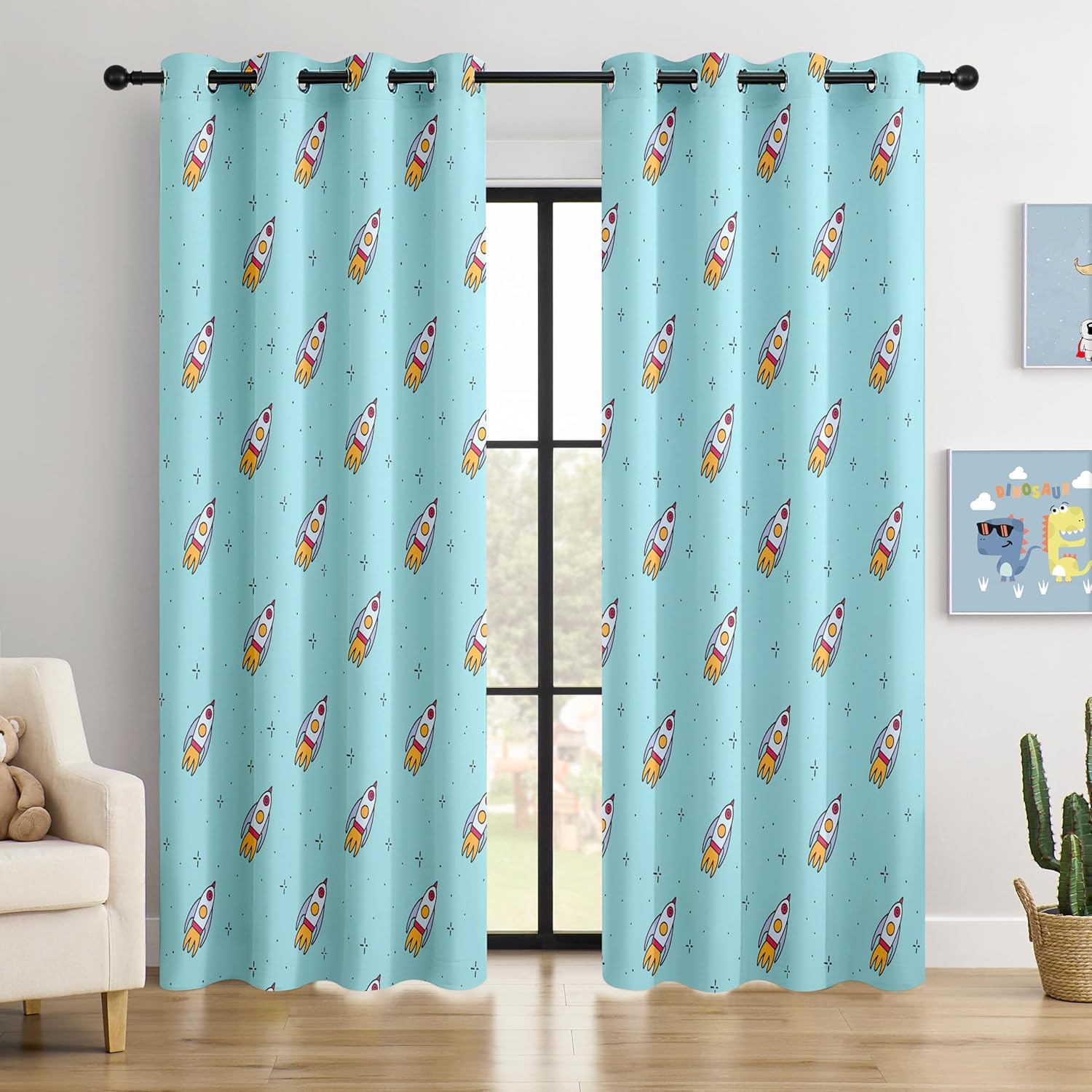 Kids Space Rockets Blackout Curtains - 100% Blackout, Thermal Insulated, Noise Reducing, Perfect for Kids Room and Nursery, 2 Panels (Aqua Mini Rockets, W52×L84)